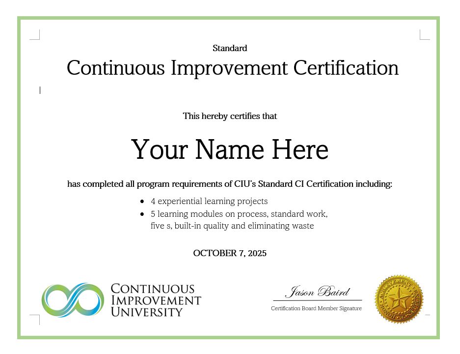 • Receive an official certification in CI you can post on your resume, LinkedIn, etc (pending review board approval)